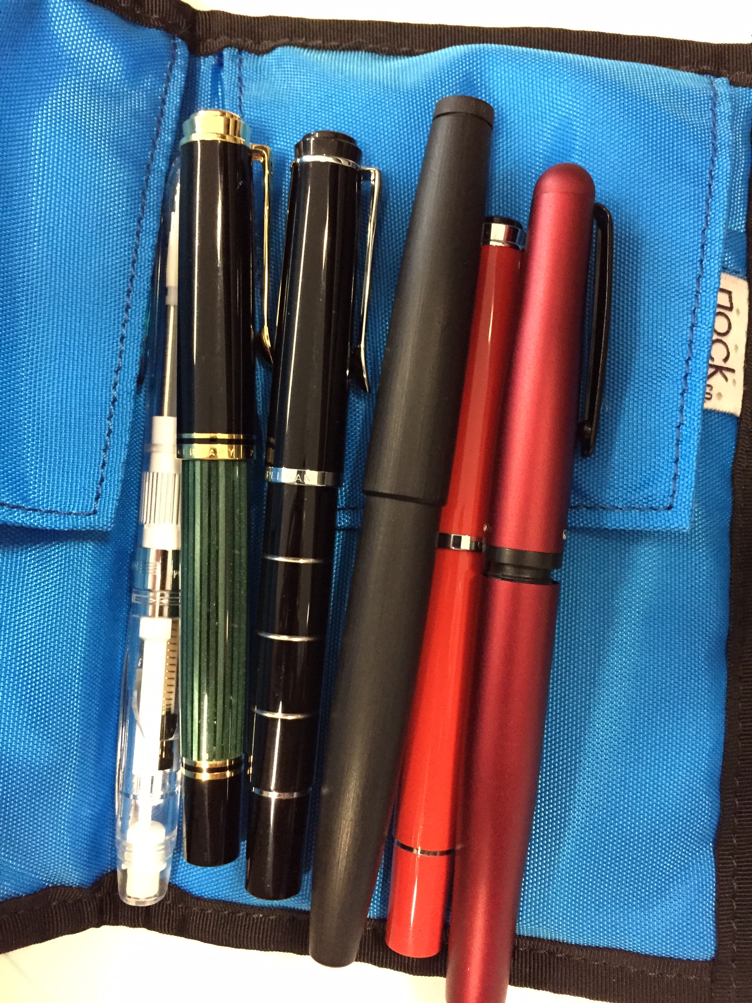 At no cost to me, I had just received: a Pelikan M400 (green; EF nib); Pelikan M215 (black and rhodium; M nib); Pelikan M205 (red; F nib); Lamy 2000 (F nib); Tombow Object (red; F nib); Platinum Multi-pen; and a selection of ink cartridges.