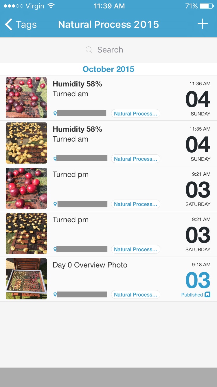 Of course the non project-critical feature of sharing through Day One’s Publish feature will allow me to Tweet daily updates of the drying beans for your viewing pleasure. No — of course I won’t! Ever watched paint dry? Perhaps the occasional one… maybe. The benefits of organisation by tag, along with rock solid sync and export options (PDF, with entries for export selectable by tag on iOS), will also keep my data organised, safe, and allow a better overview of how things went when the processing is complete.