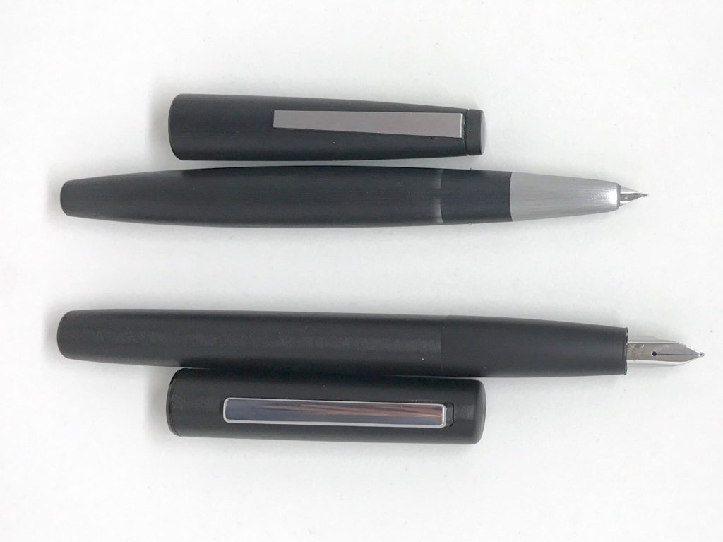 As far as the shape is concerned, there is no real taper to speak of in the cap, a minor one nearing the top of the pen, and a slightly more pronounced one as the grip approaches the nib. As you can see from the comparison table and image, at its widest point, the Lamy 2000 carries similar girth to the aion, however once the 2000’s taper begins (towards either end), any similarity quickly ends.