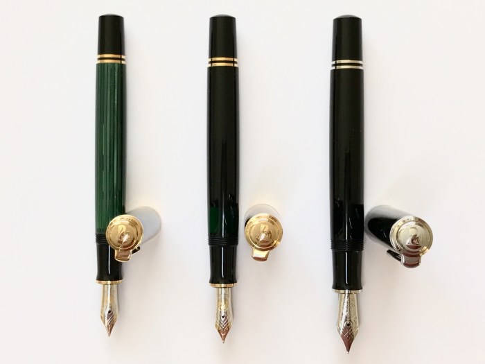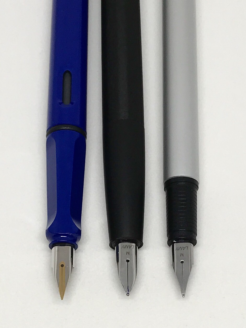 Lamy Safari with 14k nib on (L); aion (centre); Lamy Pur with steel nib (R)