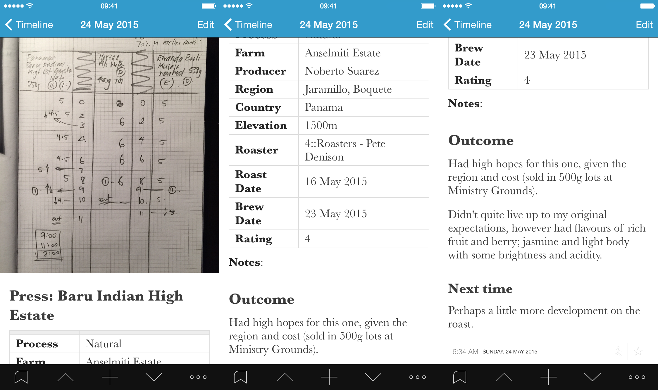 data to particular coffees after brewing and tasting involves collating the data together in a spreadsheet — which I admit is not always updated. With the photos feature in Press, I have begun to snap a photo of the roast notes page which I now keep right inside the app with the tasting notes and rating of the particular coffee — perfect!