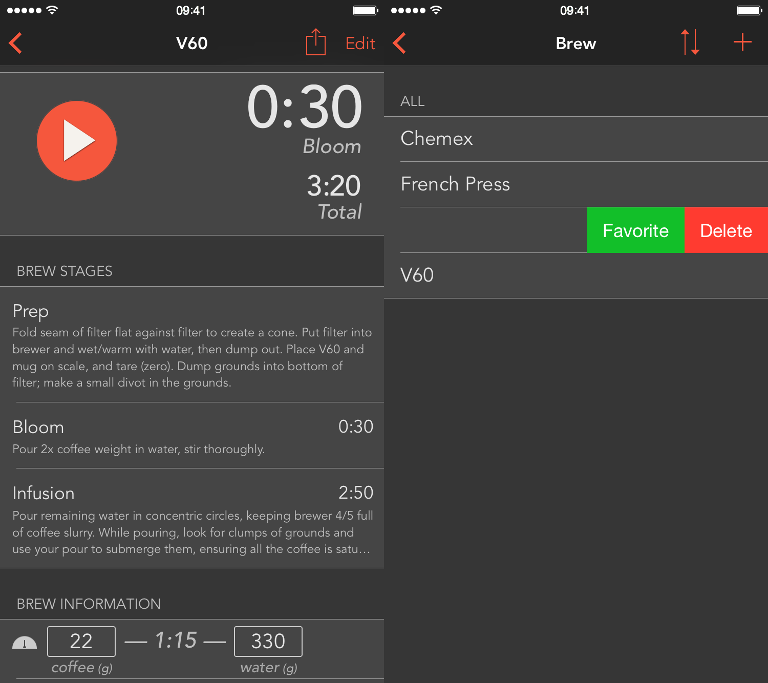 I would note however these are customisable, and you are able to add your own, featuring the timer name, coffee/water ratio (allowing calculations based on changes in dose), dose, grind, temperature, notes, and brew stages.
