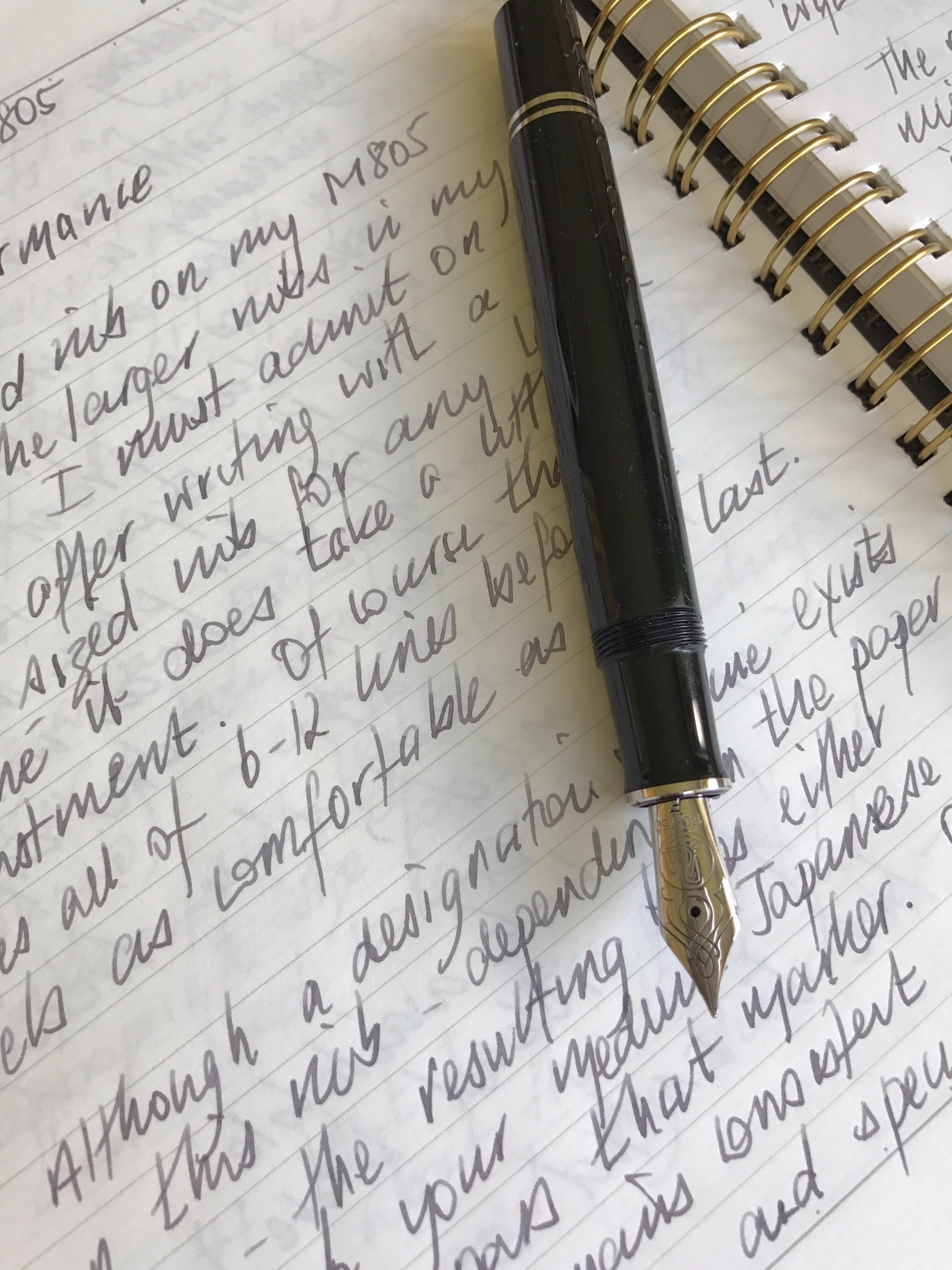 The 18k gold nib on the M805 is one of the larger nibs in my collection. I must admit on occasion, after writing with a smaller nib for any length of time, it does take a little time to adjust. Of course after a few lines it feels as comfortable as any from my pen drawer.