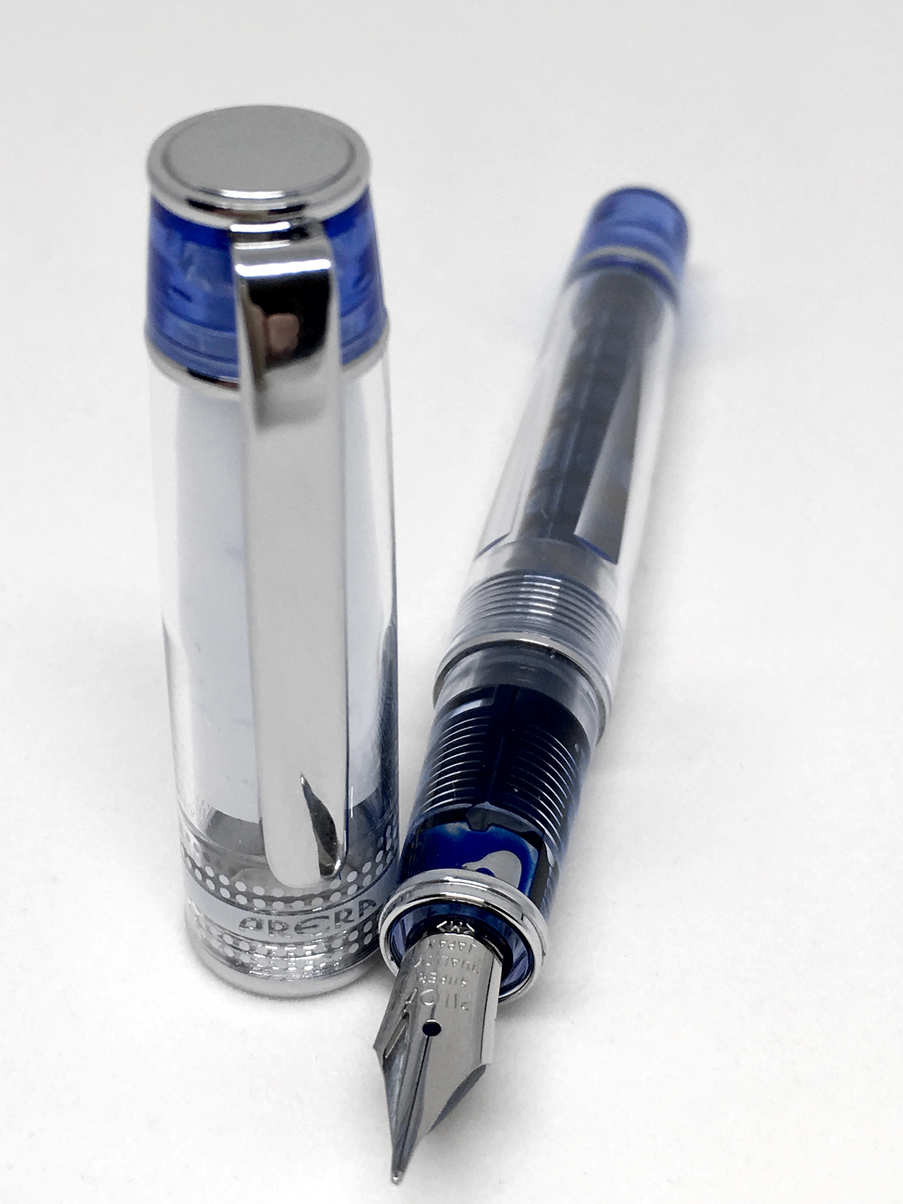 The overall aesthetics of the pen in relation to the distribution of accents at each end, metal bands along both cap and body, and transparent demonstrator barrel provide an interesting, yet not over the top look to the Prera. A great looking steel Pilot nib rounds out the pen, complementing the metal clip and banding nicely.