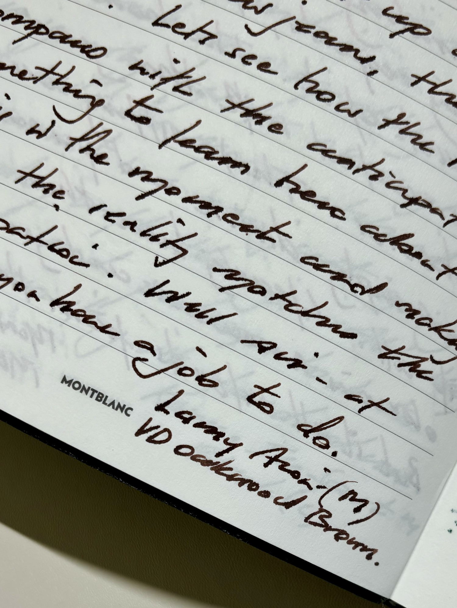 More on the pens below, however in terms of paper quality, I find the Montblanc notebooks handle almost anything, except for the wettest of inks and broader nibs. Now, a caveat here: ”wettest” and ”broadest” being extremely relative terms. If you’re reading along here, please understand these are based on the inks and nibs in my collection. One of my broadest and fastest running nibs? The OMAS Ogiva Alba — it’s a “medium” (albeit a European medium). One of my wettest inks? Van Dieman’s Oakwood Brown. Put those two in combination and there is distinct feathering on the page and show through on the reverse. This does not happen for example, with the same ink in my Pilot Custom 823 — a Japanese medium nib.