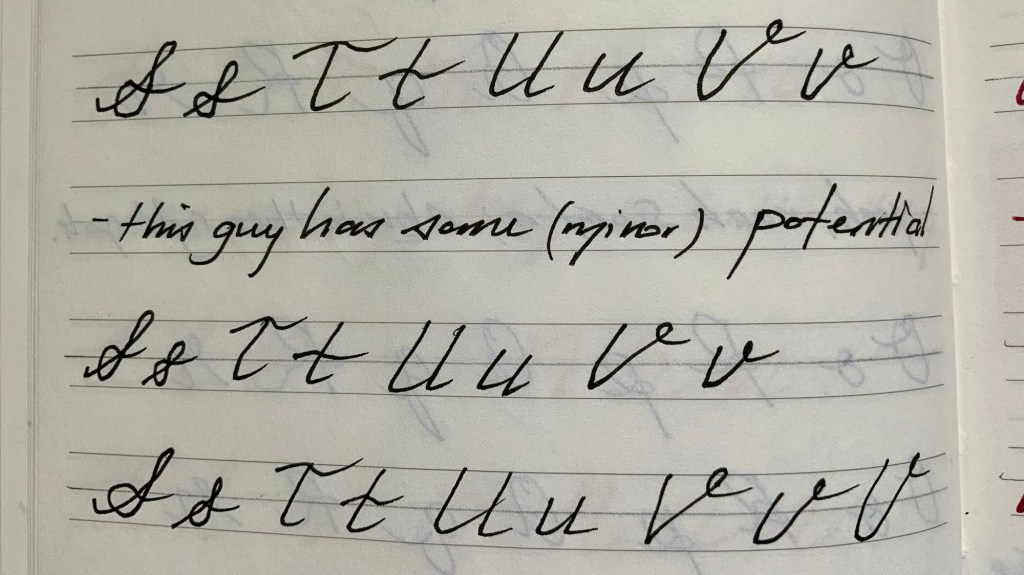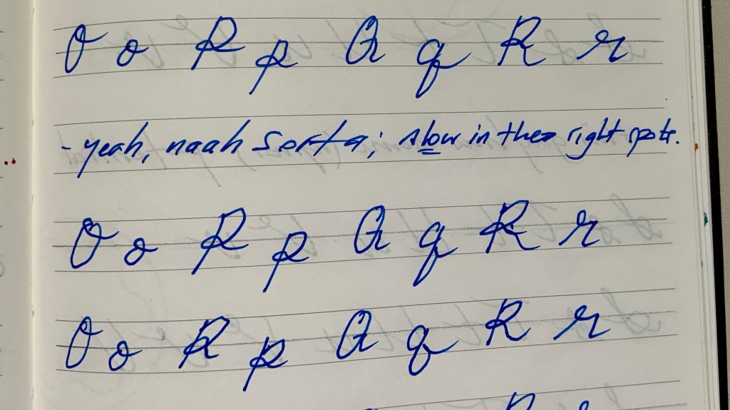 Well, shaky at best, simply weird at worst. I’m happy I gave it a shot, although I’m not even sure modern calligraphy is a style I particularly enjoy. To that end, I’m not even sure that some older styles like Copperplate or Spencerian appeal to me either. To say I just need to find something that appeals to me would perhaps be a little flippant. I feel in the back of my mind, the truth probably lies more closely to the fact that I’ll never really get around to putting in enough time to get more proficient — regardless of the style.